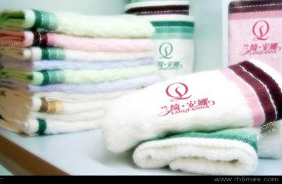 兰绮安娜品牌标志设计,兰绮安娜用品毛巾的特点柔软、使用舒适,比普通毛巾有更强的吸湿性和柔软度。毛巾上面的印花是产品品牌logo,整体的结合效果非常好,标志印花不但能增加毛巾的装饰美,也提高了产品的档次。