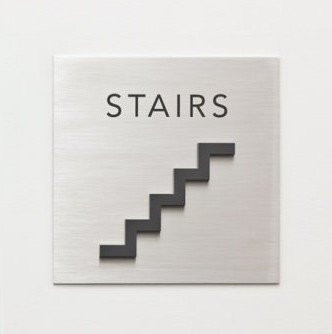 这是一块非常有立体感的创意楼梯功能标识,楼梯图形的的设计非常精巧、就以楼梯图形模板设计的功能标识图案,简单、明了、易识读,很突出功能标识的明确特效。