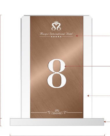 大家可以看到这个酒店餐台座,简单的给大家介绍下制作规范:牌上面印有酒店logo是采用丝印银色,牌上的序号数字制作材质是用3mm厚斜纹细拉不锈钢,工艺上电镀咖啡金色、文字镂空、打磨抛光,亚克力底座使用打磨抛光制成。可以了解到一个小小餐台座设计师也是很用心为酒店设计制作的,不仅仅要让酒店满足还要让更多的客户喜欢。