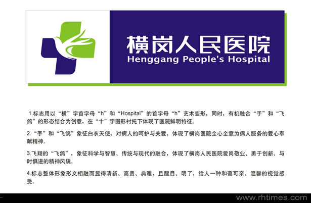 标志创意:横岗人民医院标志以“横”字首字母“H” 和“Hospital”首字母“H”艺术变形,同时,有机融合“手”和“飞鸽”的形态结合为创意,在“十”字图形衬托下体现了医院鲜明特征。